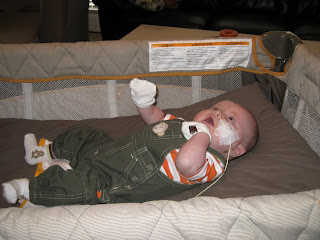 We have made a concerted effort to work with Ayden on developmental things.  Here, I am holding him in a sitting position so he must support and control his head.  He has been doing pretty well with it.  Well, for short periods of time, at least.