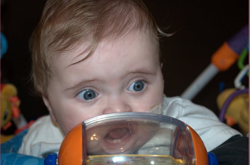 As I said, there's also fun. Despite the challenges presented by Ayden's refusal to eat and the necessity of the tube, he remains a pretty well behaved little boy. His personality continues to develop, and as his physical abilities continue to advance and improve, he is becoming much more interactive. As we can now actually play with him (rather than at him), we are starting to discover the things he enjoys. He likes to roll the ball back and forth with Allison. As you have already seen, he really enjoys his jumper. He likes the waterfalls created by his bath cups with the holes in the bottom. Of course, he likes his "cookie" jar.